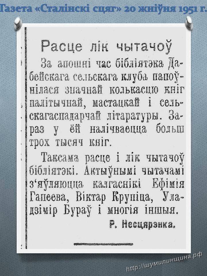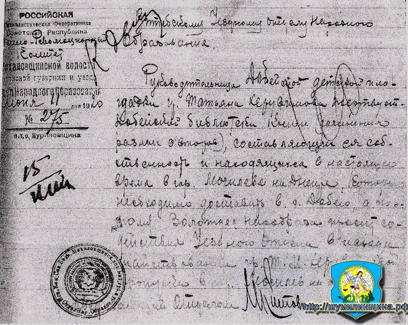 Запись от 2013-02-08 была взята в книге "Память. Историко-документальная хроника Шумилинского района»). А сегодня в Витебском областном архиве мной были обнаружены документы, в которых упоминалась Добейская изба-читальня от 11.06.1920 года.