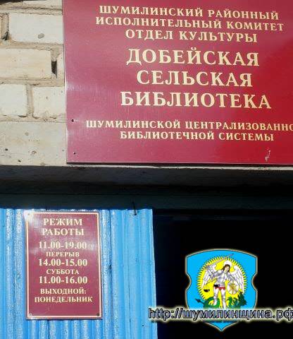 Избы – читальни работали на средства шефов и местной кооперации. 1946 год. Добейская изба-читальня: книжный фонд- 463 экз., читателей -43 чел. В 1967 году в центре колхоза располагается библиотека с книжным фондом 199 экз. и клуб к-за «Искра» - посадочных мест – 70. (Из материалов Шумилинского историко-краеведческогомузея)