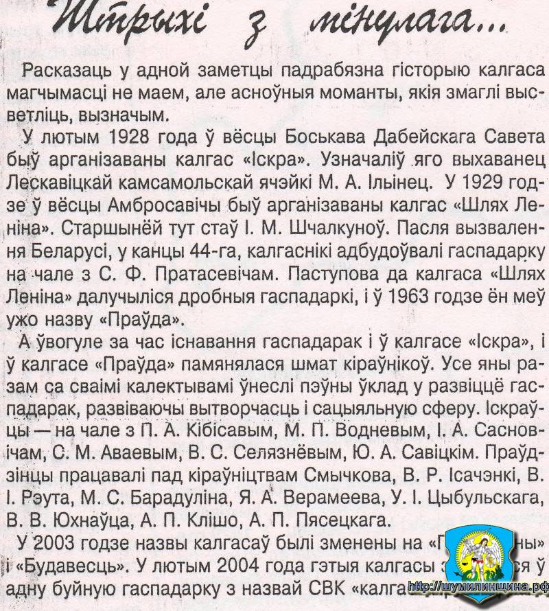 2001г. - председатель колхоза "Искра" работал Селезнёв Василий Степанович, агроном - Жедик Иван Степанович(более 30 лет отдал работе на этой должности, один из лучших агрономов района).