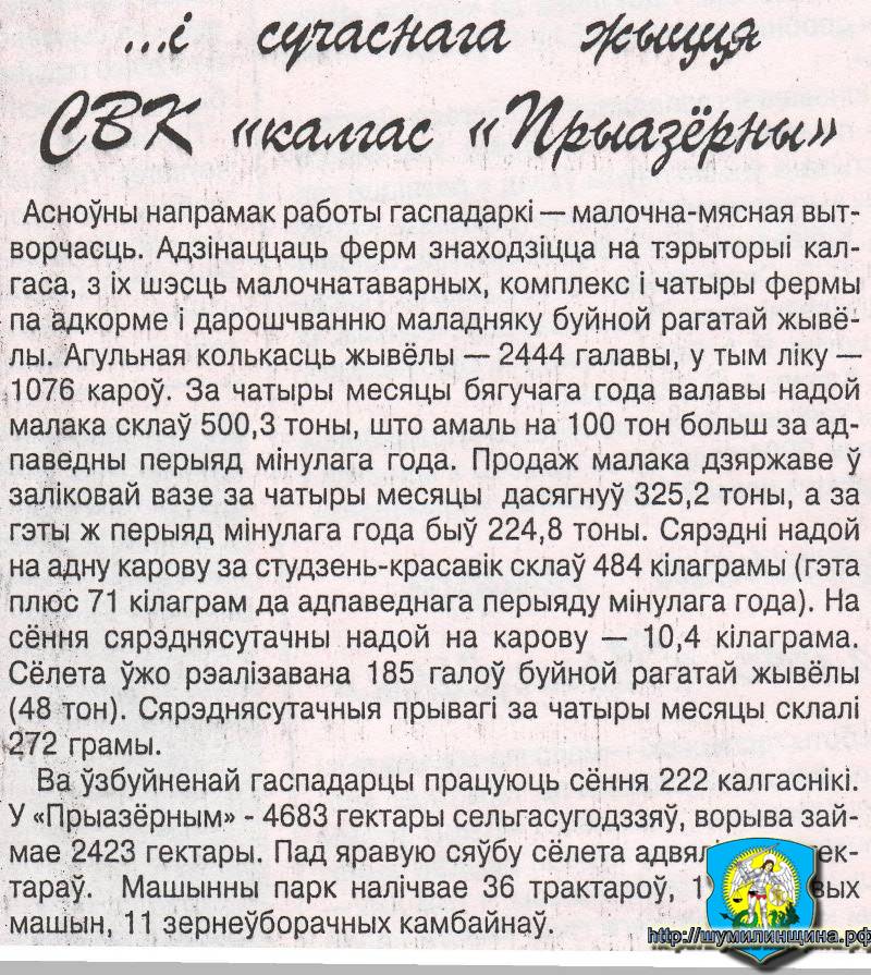 В 2004 году произошло объединение СПК "Колхоз "Приозерный" и "Колхоз "Будовесть"(бывший колхоз "Правда"), сейчас - ОАО "Приозёрный мир"