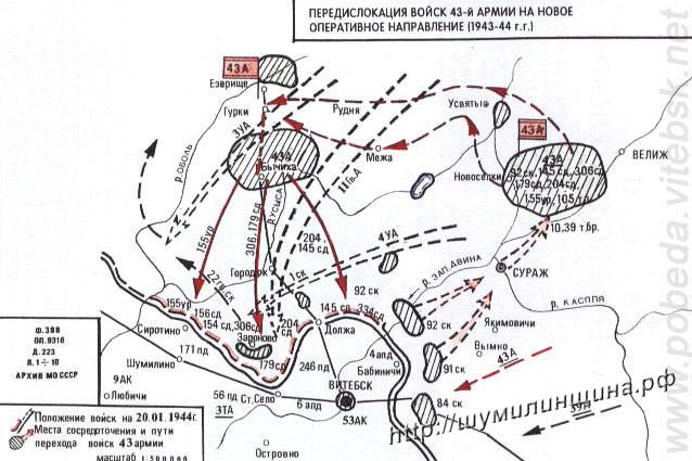 По решению командующего 1-м Прибалтийским фронтом, 43-я армия в составе восьми стрелковых дивизий (306, 179, 357, 334, 235, 156, 204 и 145-й) со средствами усиления должна была нанести главный удар своим правым флангом в общем направлении на Шумилино, прорвать оборону противника на участке Нов. Игуменщина, Тошник (фронт прорыва 7 км), разгромить его шумилинскую группировку и к исходу первого дня выйти на рубеж выс. 147, 9, Ильницы, Ольховики, Язвино. В дальнейшем армия должна была своим левофланговым корпусом (92-м), свертывая оборону противника влево, выйти и прочно закрепиться на рубеже реки Западная Двина, а главными силами форсировать реку и овладеть рубежом Кривое Село, Замошье Черногостье. Правее в общем направлении на Сиротино, Бешенковичи наносила удар 6-я гвардейская армия.