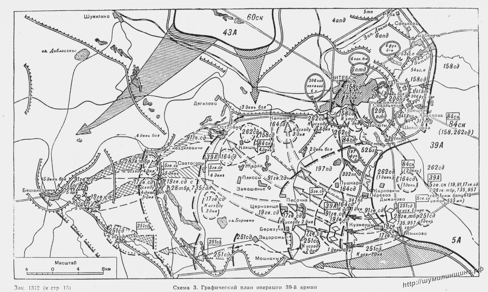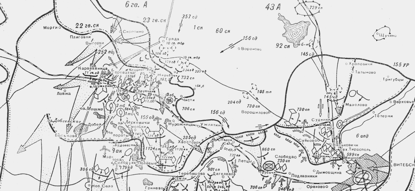 Части 1-го и 60-го стрелковых корпусов, отражая контратаки, успешно преодолевали тактическую глубину вражеской обороны. После захвата ими Шумилино немцы стали быстро откатываться на юг, стремясь закрепиться в межозерных дефиле по линии озер Добеевское, Лесковичи, Будовище.