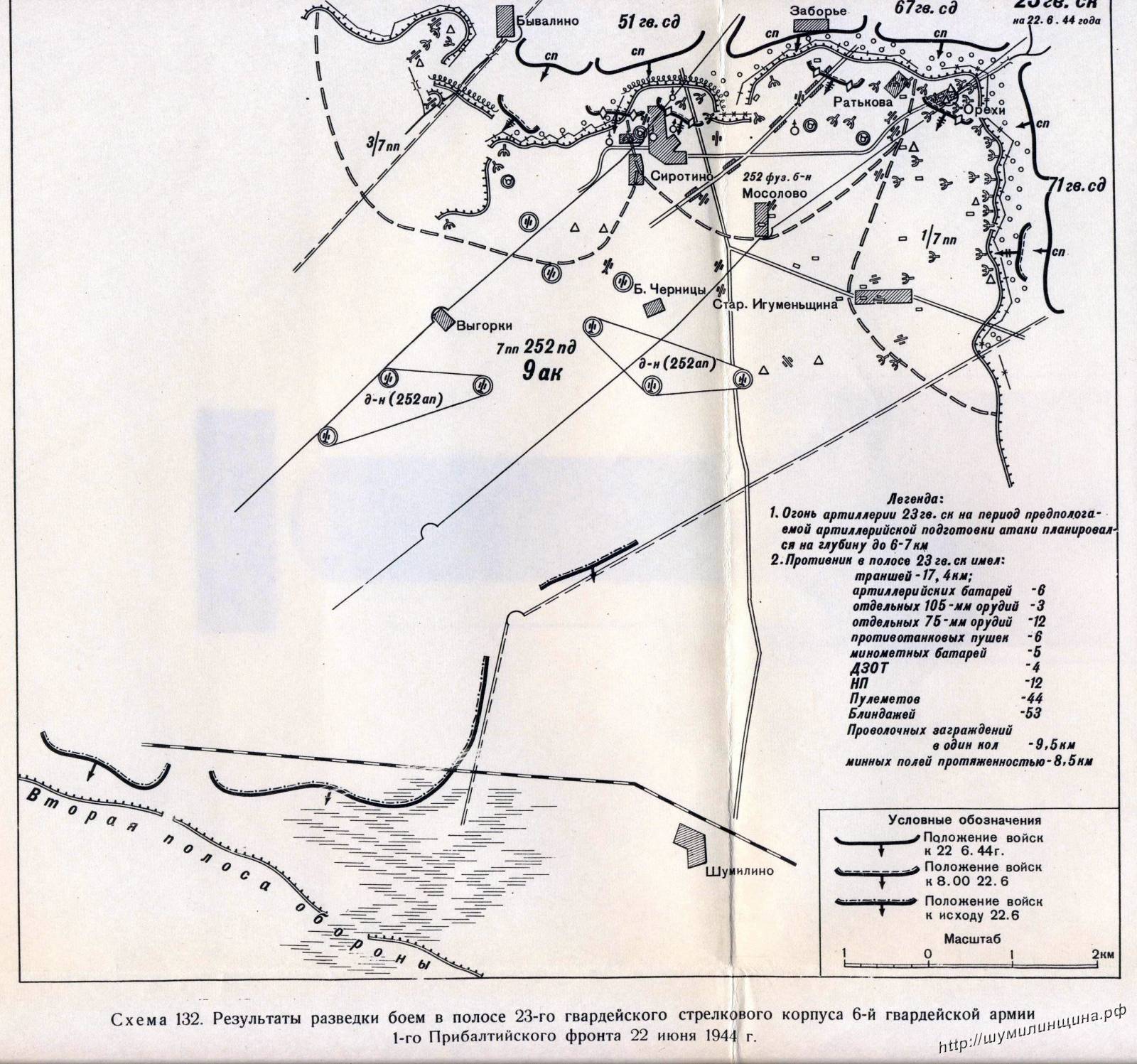 Вот небольшие издержки из плана наступления советских войск в июле 1944 года. Оборона витебского плацдарма, в особенности его первой оборонительной полосы, была основана преимущественно на системе артиллерийского огня. Предыдущие наступательные бои наших войск и разведка боем выявили, что главным препятствием, преграждавшим путь пехоте и танкам, была вражеская артиллерия. Скрытно располагаясь в непосредственной близости к первым двум линиям траншей, она быстро сосредоточивала заградительный огонь по атакуемым участкам и останавливала наступающие части, даже если им удавалось захватить первую траншею.