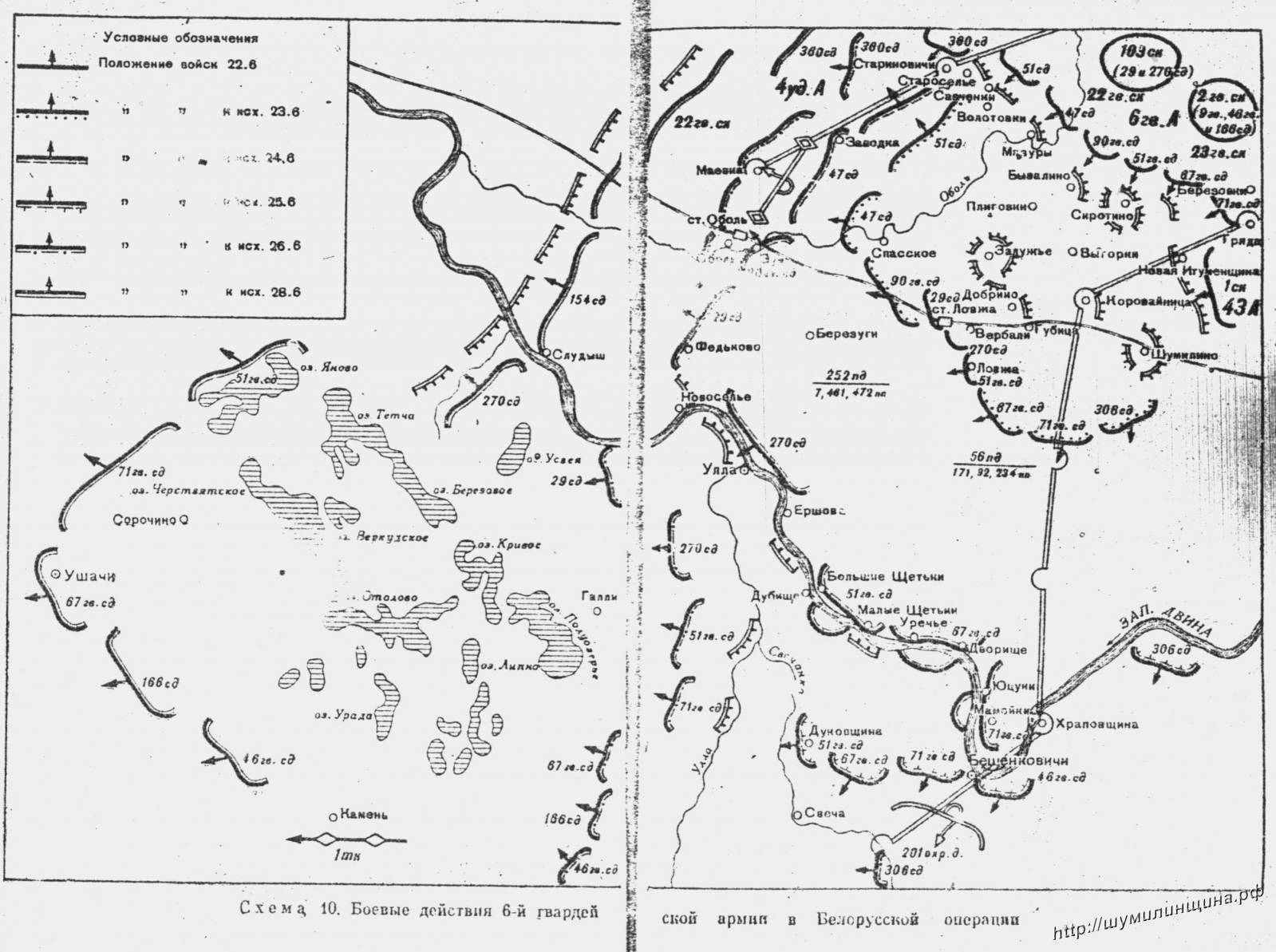 23 июня 1944 г освобожден Шумилинский район . В освобождении р–на участвовали 51–я (генерал–майор С.В. Черников), 71–я (генерал–майор Ч.П. Сиваков) стрелковые дивизии 23–го гвардейского стрелкового корпуса 6–й гвардейской армии; 179–я (полковник М.М. Шкурин), 306–я (генерал–майор М.И. Кучерявенко) стрелковые дивизии; 10–я отдельная танковая бригада (полковник М.В. Волков), 39–й гвардейский минометный полк (подполковник П.В. Шутов) 1–го стрелкового корпуса 43–й армии 1–го Прибалтийского фронта.