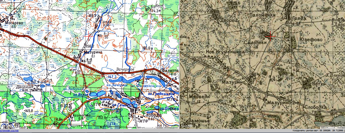 По старополоцкой дороге на Сиротино (если из Витебска), поворот направо в Мазурино, между Мазурино и Гряда, примерно в километре, просматривается гравейка налево, координаты 55.35932, 29.714017 , карты отправил. К сожалению эта гравейка - похоже всё, что осталось от центральной улицы деревни Салопеки, в 1936м году было 10 дворов.