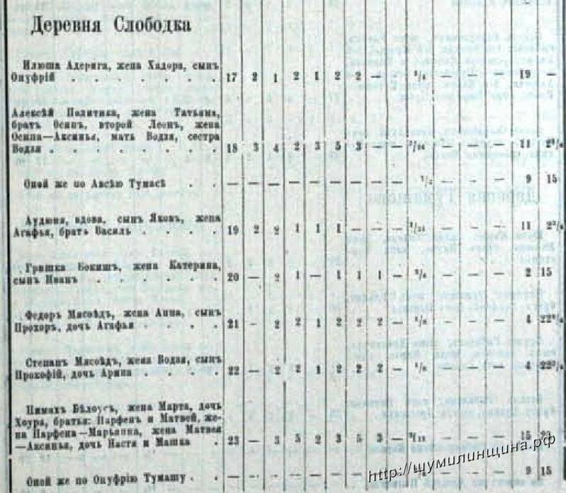 В 1781 году в Соснянском войтовстве указана деревня Слободка. Здесь проживали 7 хозяев купеческого происхождения с семьями: Илюша Адерига, Алексей Политика, Аудюша вдова, Гришка Бокиш, Федор Мясоед, Степан Мясоед, Пимен Белоус (всего 35 душ)