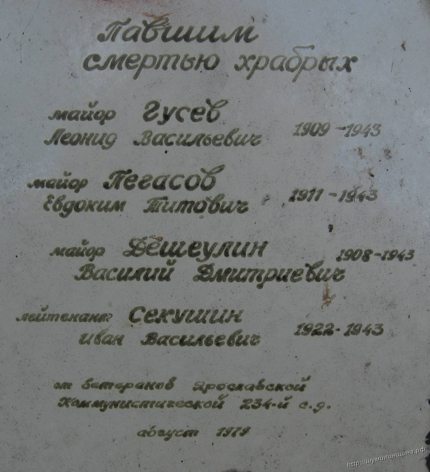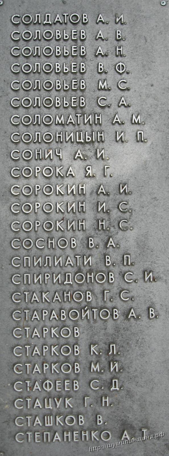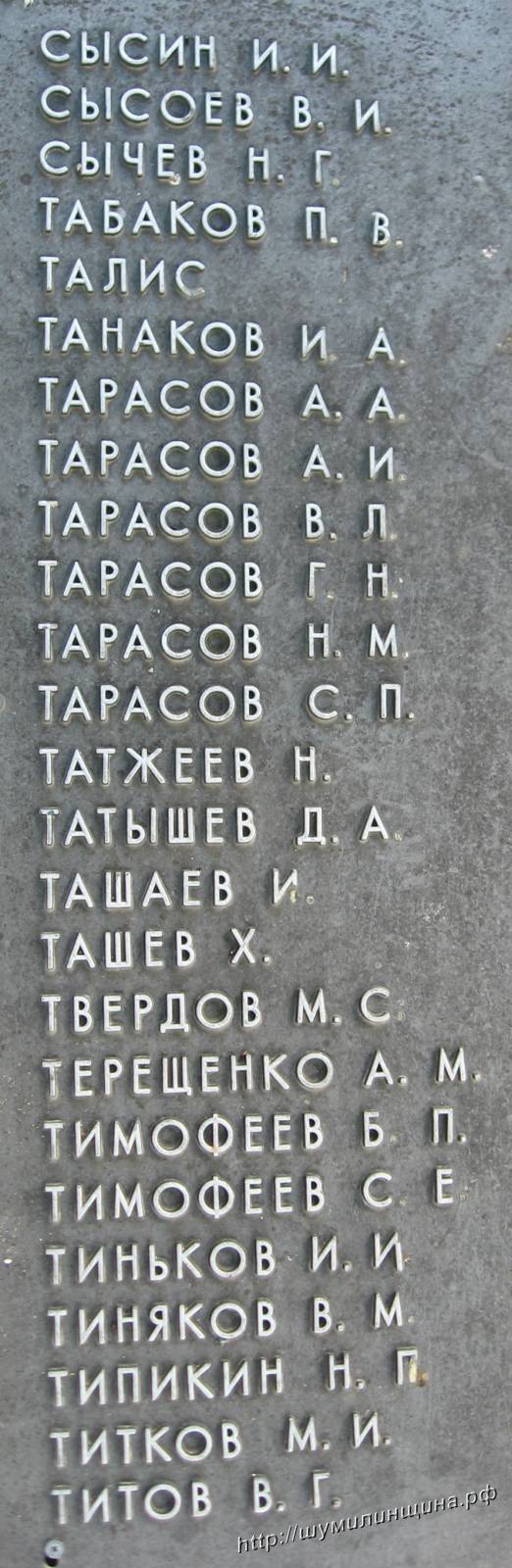 Из них Радостев А.К., Болдин А.П., Томилов А.Ф. увековечены на плитах и числятся перезахоронеными воле деревни Дворище Шумилинского района.