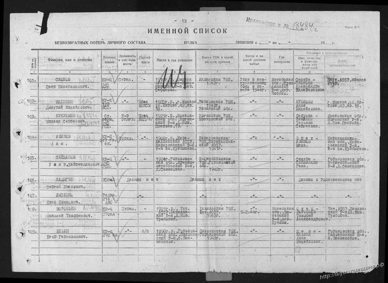 Юрий, согласно донесению 6948, в могиле номер 73 северозападнее д.Пухи, Сиротинского района, похоронены ещё 4 воина вместе с Каймаковым Григорием Степановичем. Но их я тоже не нахожу в списках перезахороненных во Дворище и Свободе. Может быть их и не перезахоранивали. Такое возможно?